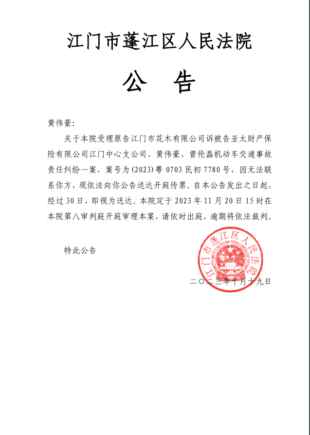 (2023)粤0703民初7780号原告江门市花木有限公司诉被告亚太财产保险有限公司江门中心支公司、黄伟豪、曾伦磊机动车交通事故责任纠纷一案开庭公告