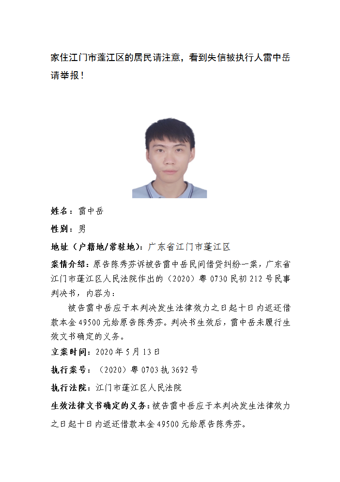 上一篇: 上一篇: 【失信曝光】蓬江法院今日头条失信被执行人名单