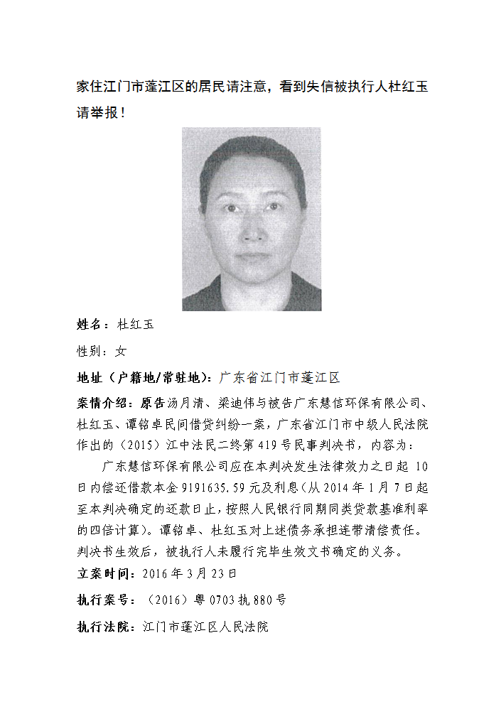 【失信曝光】蓬江法院今日头条失信被执行人名单